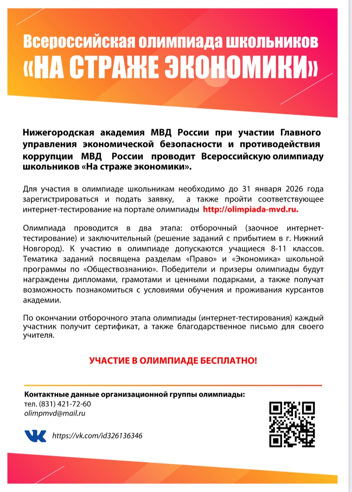 Для участия в олимпиаде школьникам необходимо до 31 января 2026 года зарегистрироваться и подать заявку, а также пройти соответствующее интернет-тестирование на портале олимпиады http:olimpiada-mvd.ru.