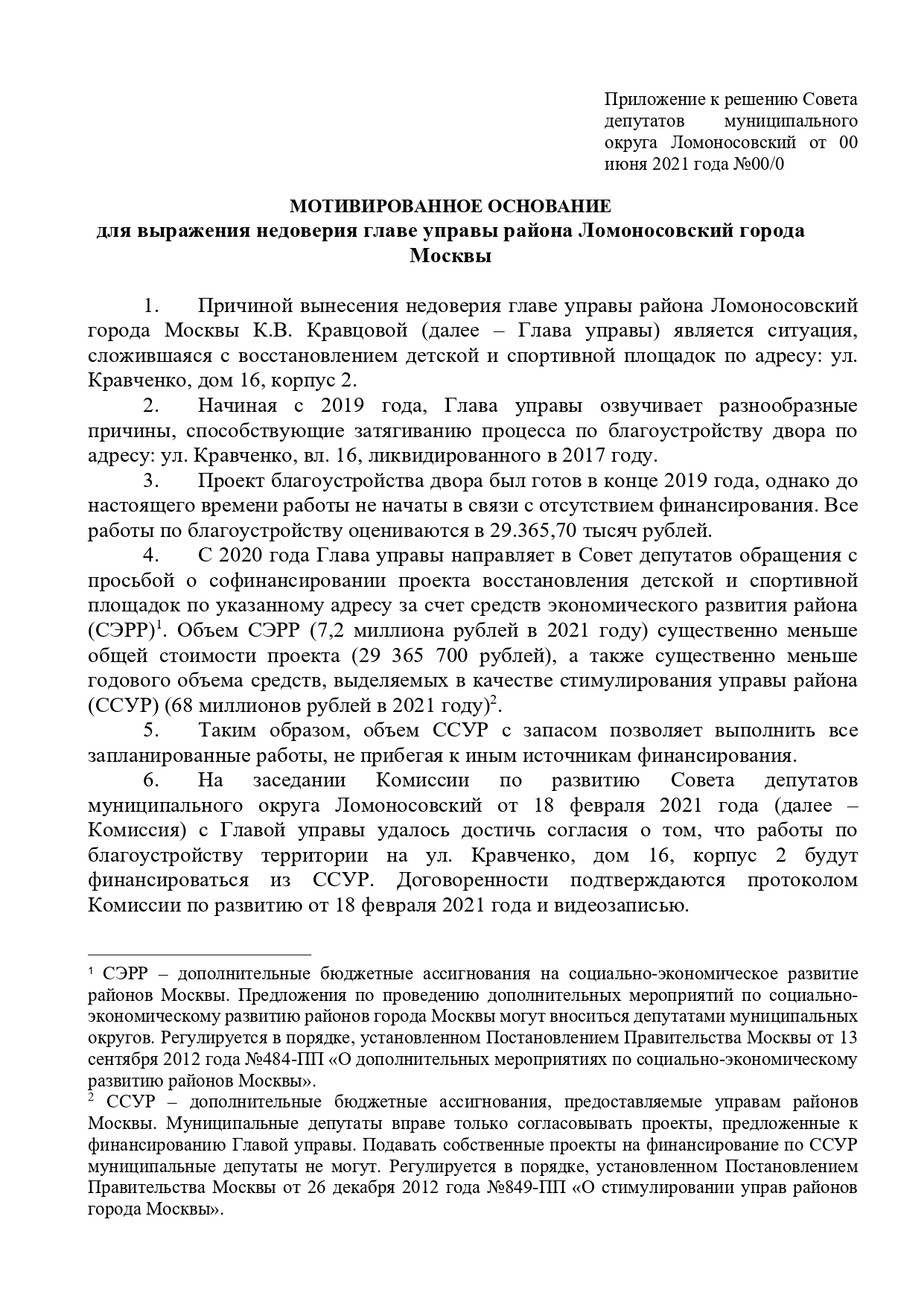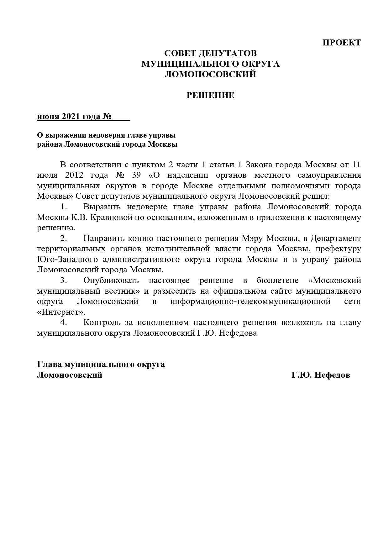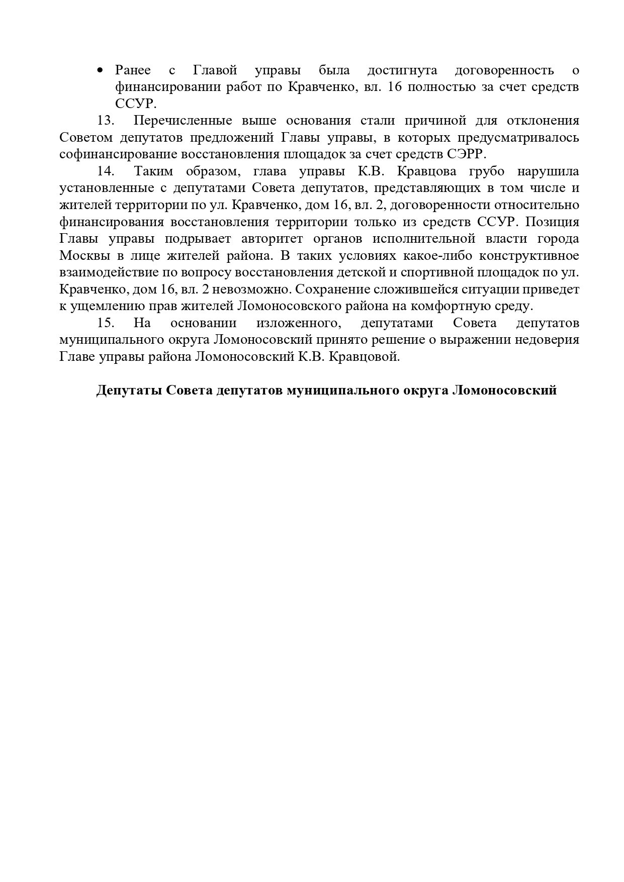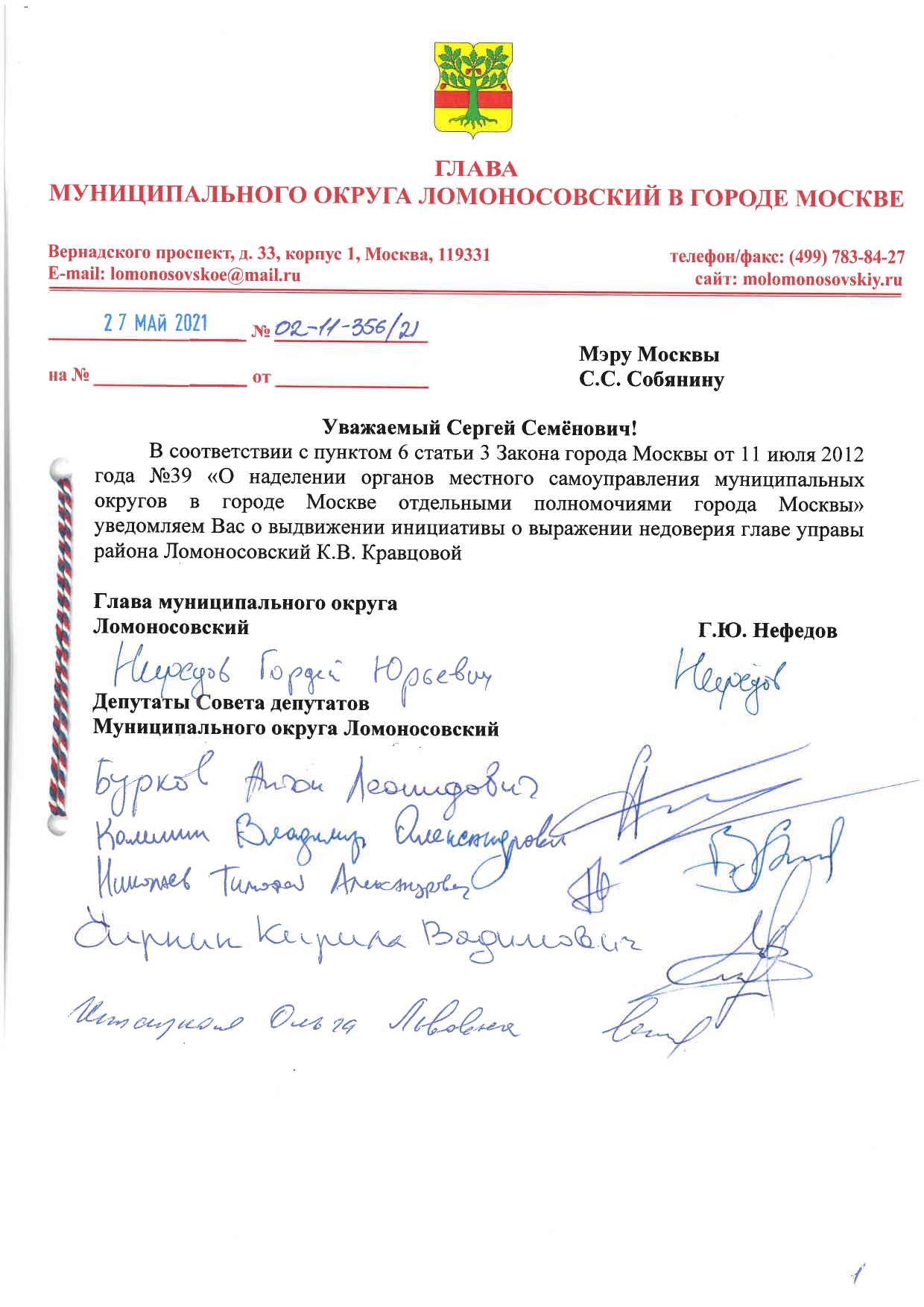 6 депутатов Совета депутатов подписали и направили Мэру Москвы обращение с пояснением своих мотивов для вынесения главе управы Ломоносовского района недоверия.