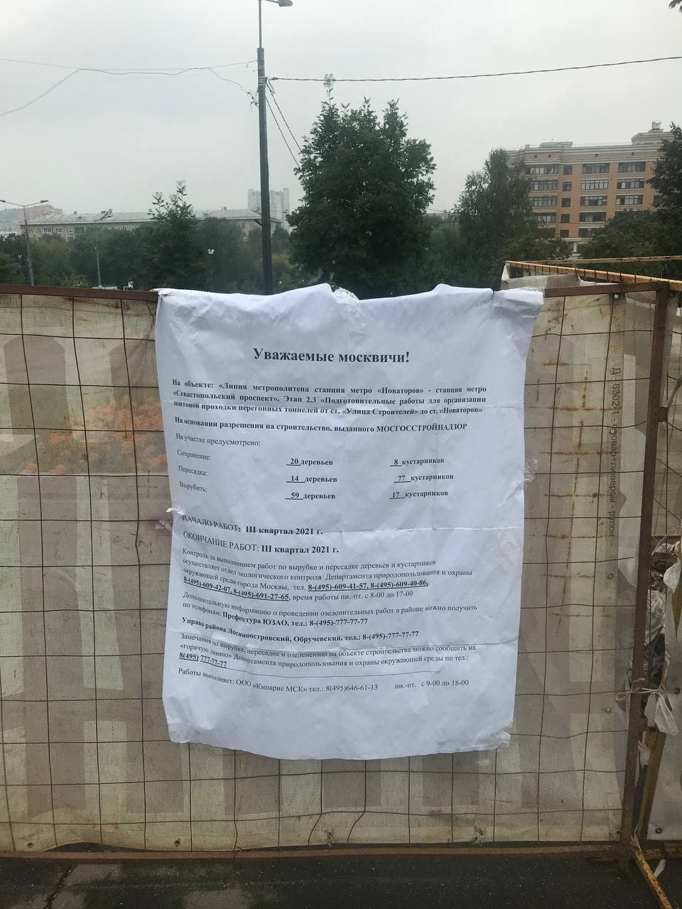 Рядом с уже вырубленными деревьями обнаружен информационный щит (на фото), на котором отсутствует информация о наименовании заказчика, номера телефонов заказчика, должности и фамилии производителя работ, даты начала и окончания работ. Также выяснилось, что работы выполняются ООО «Кипарис МСК» (тел. 8-495-646-61-13). По указанному телефону в ООО «Кипарис МСК» уточнили, что они являются субподрядчиком организации АО «Трансинжстрой», которая является подрядчиком АО «Мосинжпроект». В свою очередь, АО «Мосинжпроект», по словам уполномоченного лица из ООО «Кипарис МСК», является заказчиком указанных работ.